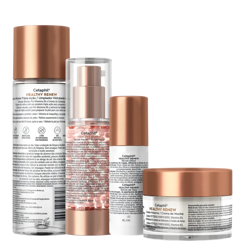 O Kit Cetaphil Healthy Renew traz água micelar, sérum facial, creme facial noturno e sérum para área dos olhos. Um cuidado completo para deixar a pele revitalizada e radiante. A fórmula ajuda a reduzir rugas e linhas finas, e melhora a luminosidade, a firmeza e a elasticidade da pele.